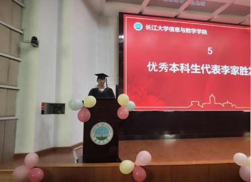 接着,李家胜代表本科毕业生进行发言。他真诚地表达了母校的培养和教育让他受益终身,他将永远铭记母校的教诲,不忘初心,砥砺前行。