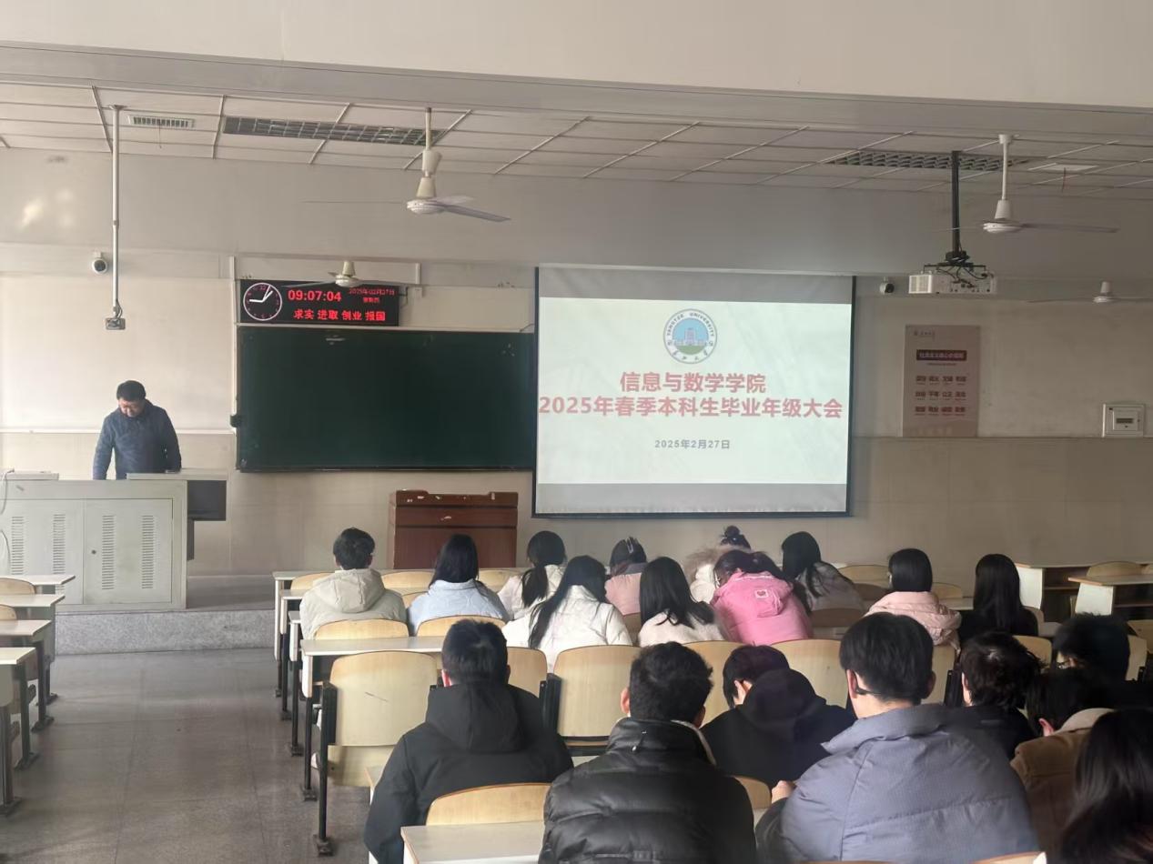 在2月27日上午9点于12教104召开本科生毕业年级大会,院党委副书记谷军、院团委书记黄何以及毕业年级本科生参与会议。