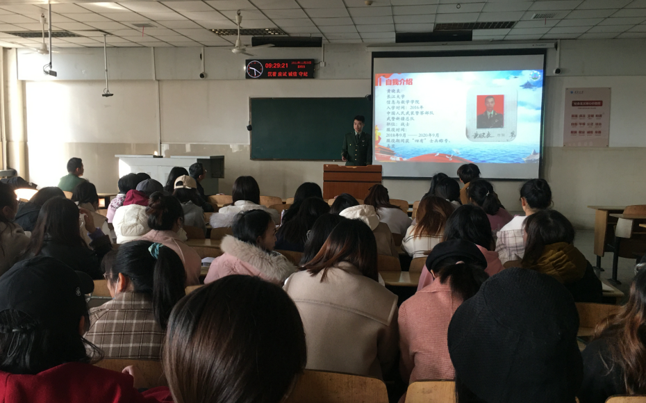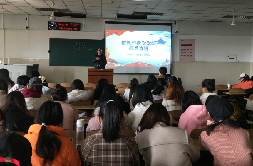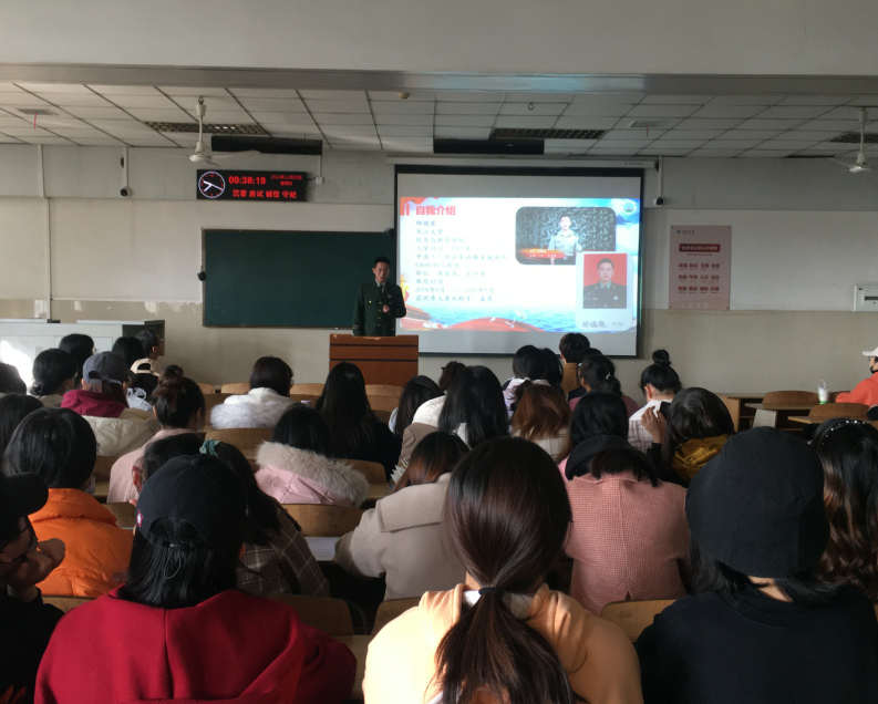 于12教202举办了“2022届毕业生征兵宣讲”活动,出席本次活动的有院党委副书记袁海山,辅导员严星、黄何老师以及全体2022届毕业生。本次大会由副书记袁海山主持。
