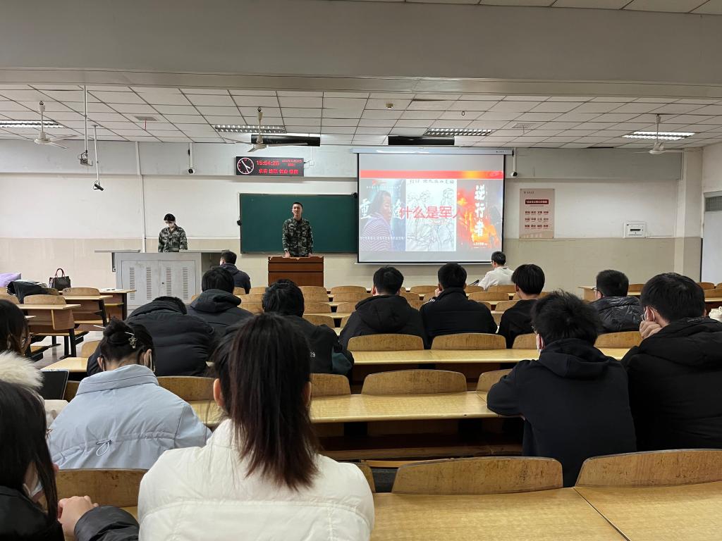 今年退伍的士兵付淳宇宣讲,他从自己在部队的个人经历及自己作为武警抗洪抢险的感人故事入手,通过与同学的问题互动让大家了解军人形象,鼓励大家勇于追逐梦想,挑战自我,一切皆有可能。