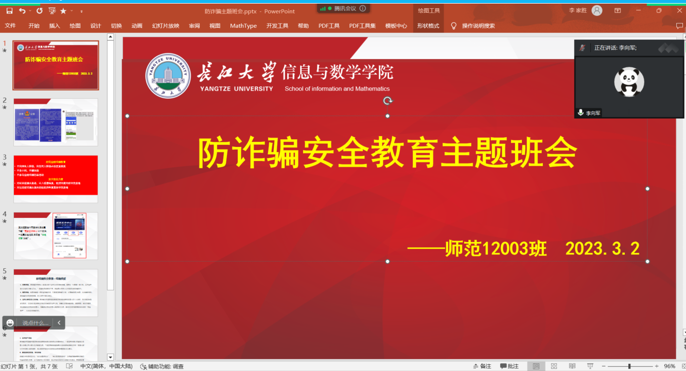 随后,大家一起学习“长江大学防电信诈骗、防不良网贷告知与承诺书”及“春季开学,传染病怎么预防?”两个文件内容。适逢春季开学季,病毒传播迅速,大家一起了解并学习了预防传染病知识。开学以前,学生中电信诈骗呈现上升趋势,大家一起了解了目前的情况并深入的学习了电信诈骗的案例,并逐一检查了同学们是否下载“国家反诈”APP,是否开启了来电预警。