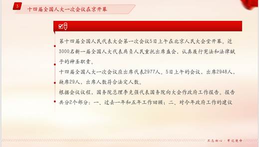 三、第十四届全国人民代表大会第一次会议5日上午在北京人民大会堂开幕。近3000名新一届全国人大代表肩负人民重托出席盛会,认真履行宪法和法律赋予的神圣职责。根据会议议程,国务院总理李克强代表国务院向大会作政府工作报告。报告共分2个部分:一、过去一年和五年工作回顾;二、对今年政府工作的建议。李克强在报告中指出,2022年是党和国家历史上极为重要的一年。党的二十大胜利召开,描绘了全面建设社会主义现代化国家的宏伟蓝图。面对风高浪急的国际环境和艰巨繁重的国内改革发展稳定任务,以习近平同志为核心的党中央团结带领全国各族人民迎难而上,全面落实疫情要防住、经济要稳住、发展要安全的要求,加大宏观调控力度,实现了经济平稳运行、发展质量稳步提升、社会大局保持稳定,我国发展取得来之极为不易的新成就。