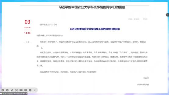 于5月7日下午16:30带领同学们学习习近平总书记给中国农业大学科技小院的学生回信相关内容。