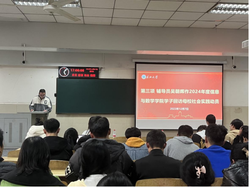 于12月7日下午四点在12教402举行回访母校社会实践动员大会,参与大会的有院党委副书记谷军、学工办主任钟赛、23级辅导员吴朝晖、23级兼职辅导员黄才润和全体23级学生。本次大会由辅导员吴朝晖老师主持。