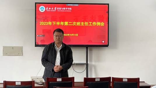 于10月13日在8教406召开2023年下半年第二次班主任工作例会。院党委书记李喜成、院党委副书记谷军,院学工办主任钟赛,院团委书记黄何、辅导员吴朝晖以及全体班主任参与此次例会。