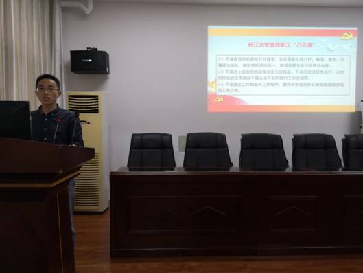 会上院党委副书记袁海山传达了校党风廉政建设宣传教育月的活动方案,带领大家集中学习《长江大学党员领导干部“八不准”》、《 长江大学党员职工“八不准”》、《长江大学党员教师“六不准” 》相关条例,并为大家上了一次题为《高校教师的必修课---廉洁自律》专题党课。
