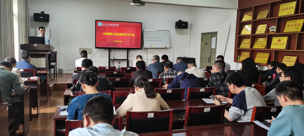 在8教406开展4月教职工政治理论学习暨支部主题党日活动。院党委书记李喜成主持学习活动,院领导班子成员及全体教职工参加会议。本次政治理论学习包括跟进学习习近平总书记重要讲话和重要指示批示精神、两会”专题、主题教育、师德师风、法治和网络建设五个专题。