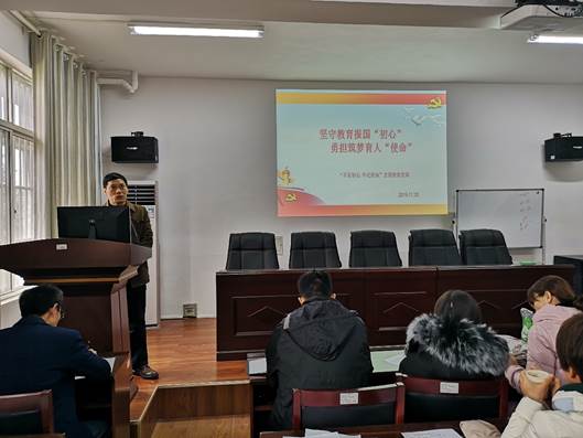 教师如何坚守初心、勇担使命。要求大家坚守教育报国的初心,履行为国育人为党育才的神圣使命,认真备好课、上好课、管理好课堂,用父母情般怀关爱学生,用高尚的师德感化学生,用坚定的信仰培养学生,用渊博的学识传授学生,让学生成为德智体美劳全面发展的社会主义建设者和接班人。