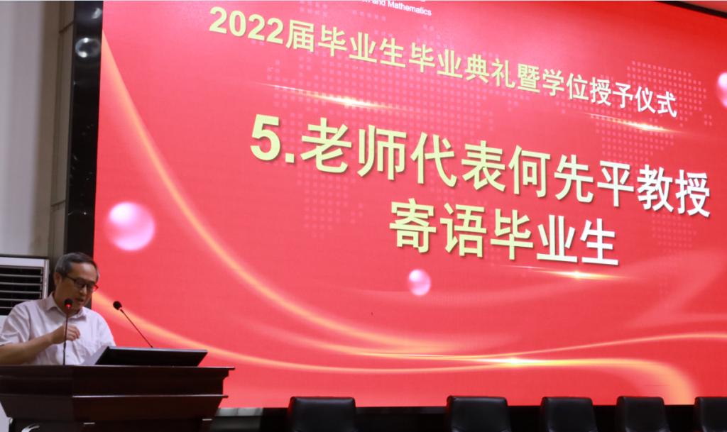 教师代表何先平教授表达了对毕业生们的不舍,更希望他们在今后的人生中继续学习。寄语中何先平还借用毛主席的话“你们青年人朝气蓬勃,好像早晨八九点钟的太阳。希望寄托在你们身上”希冀2022届毕业生们继续谱写辉煌,成为中华民族复兴的脊梁。