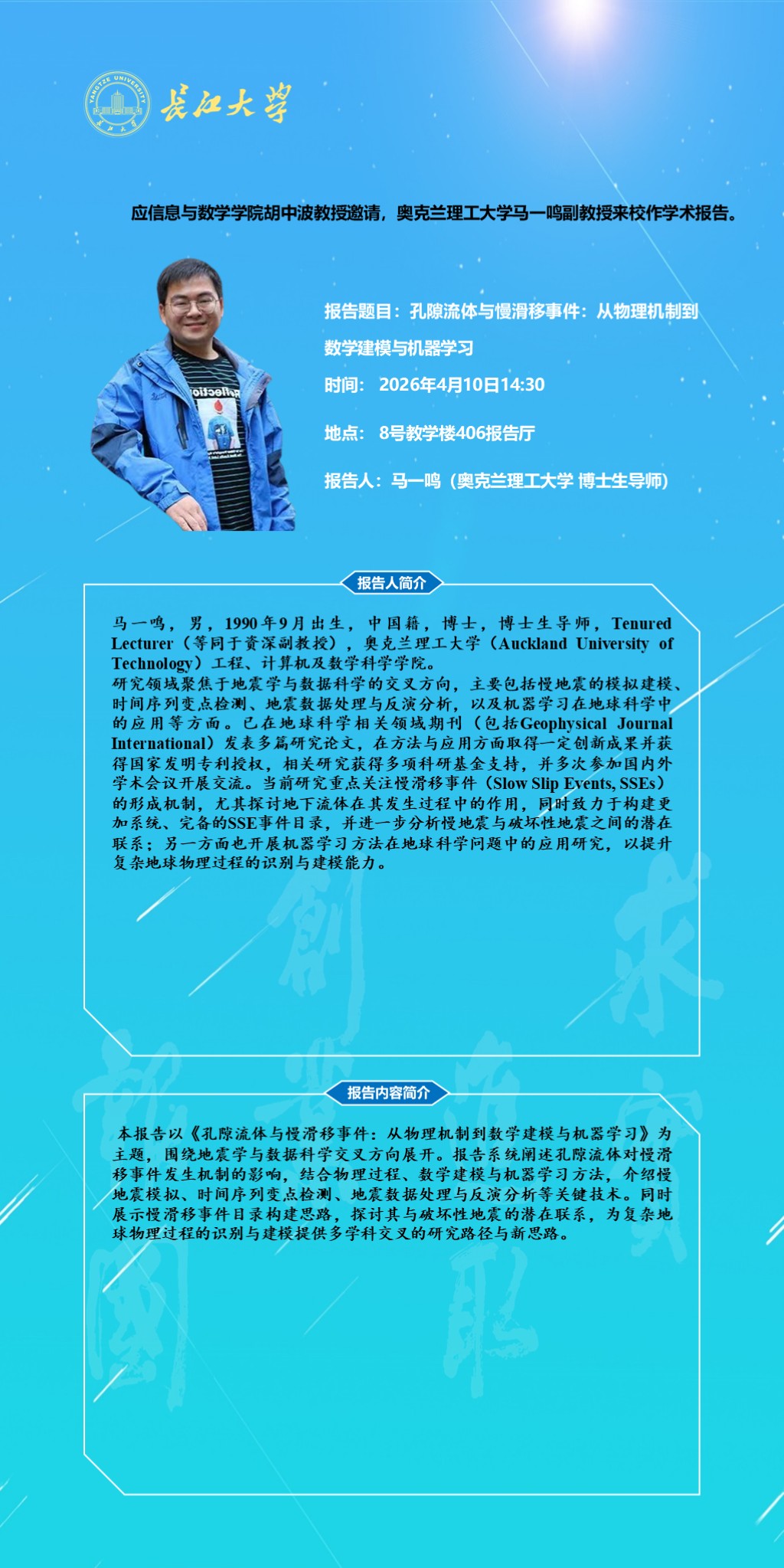 报告人 马一鸣(奥克兰理工大学 博士生导师) 报告时间 2026年4月10日14:30